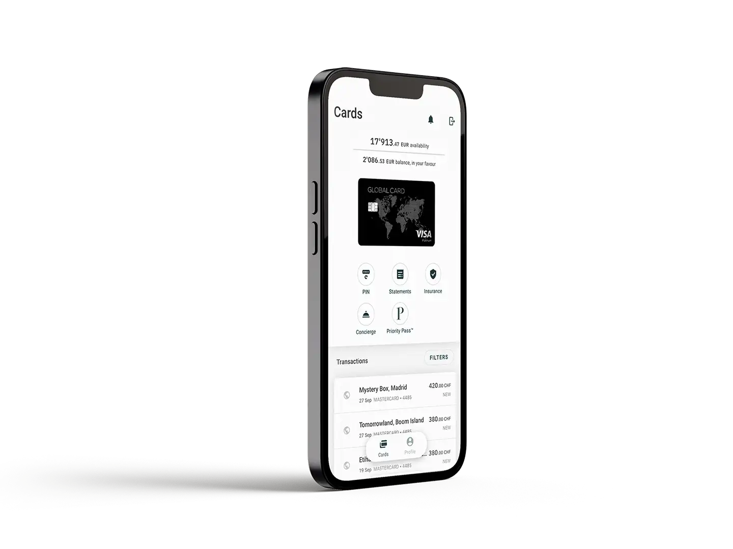 - Go to the «Cards» area in the card24 app. If your type of card includes this service, you will see the «Priority Pass» symbol under the available functions.