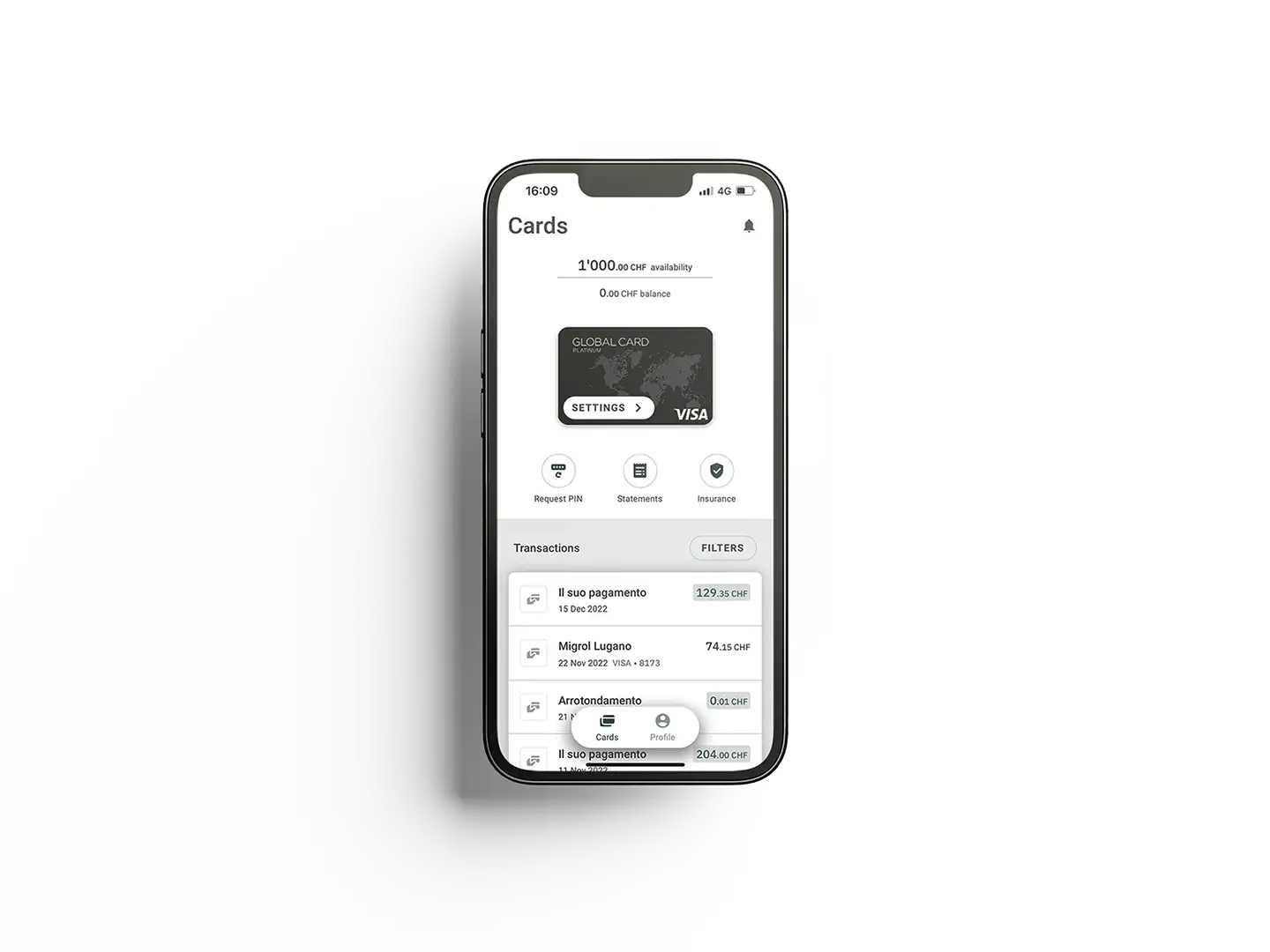 - Go to the «Cards» area in the app. Access card settings by clicking on one of your cards or the «Settings» symbol. If the function is no longer displayed, you’ll be able to find it under «More».
